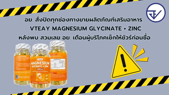 อย. เดินหน้ากวาดล้างผลิตภัณฑ์สุขภาพผิดกฎหมายอย่างเข้มงวด ประสานแพลตฟอร์มดิจิทัลปิดทุกช่องทางจำหน่ายผลิตภัณฑ์ VTEAY MAGNESIUM GLYCINATE + ZINC หลังพบแอบอ้างเลข อย. สินค้าอื่น และปลอมแปลงเอกสารราชการเพื่อสร้างความน่าเชื่อถือให้กับร้านค้าออนไลน์